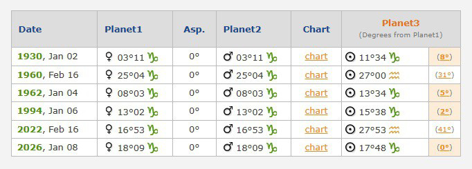 Going around the outside of the Venus star tells us that the UnderWorld (superior) conjunction with the Sun going clockwise from Pisces is in Capricorn. This cycle repeats every 8 years, and every 4 of these 8 year repeats (32 years), She is joined by Mars. So the last Capricorn UnderWorld conjunction of Venus and Mars was in 1994.