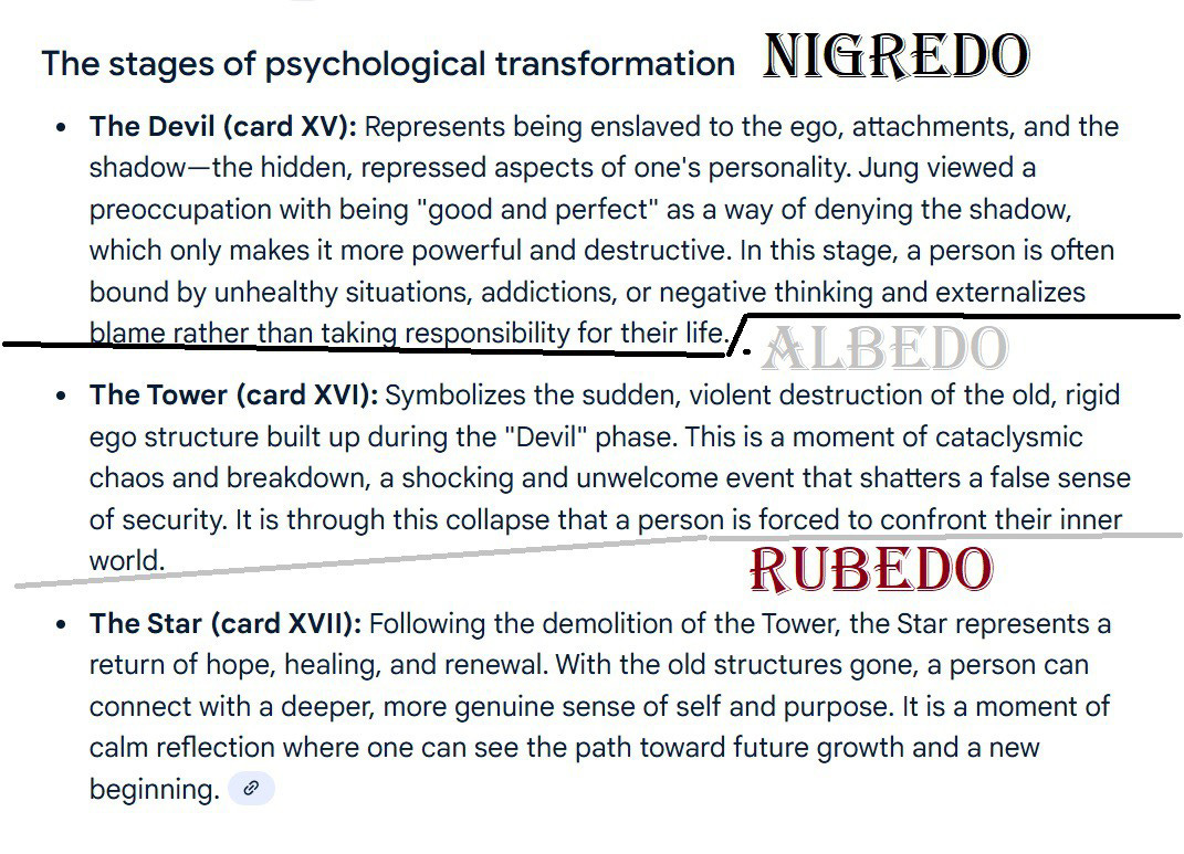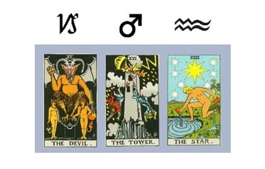 This chapter of the Tarot has a very clear and striking Alchemical parallel. The Nigredo of the Devil is followed by a blinding flash of light (Albedo) in the Tower, and a gradual Rubedo (reddening/embodiment) in the Star.