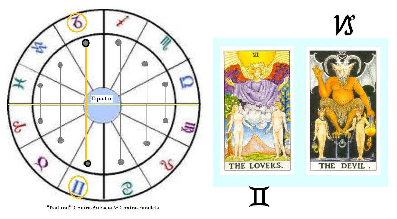 Capricorn is associated with the Devil card and is basically an inversion of the Lovers card. And these two signs, Gemini and Capricorn are inverse to one another across the Equinoctial axis. The young lovers, once enamored with their art, are fated to find themselves inverted and disillusioned.
